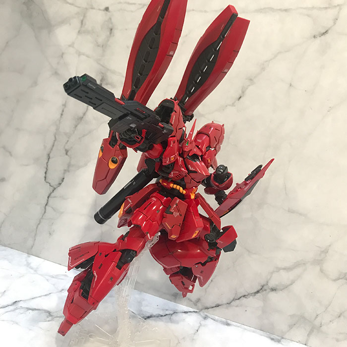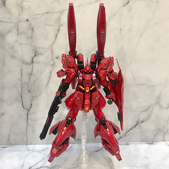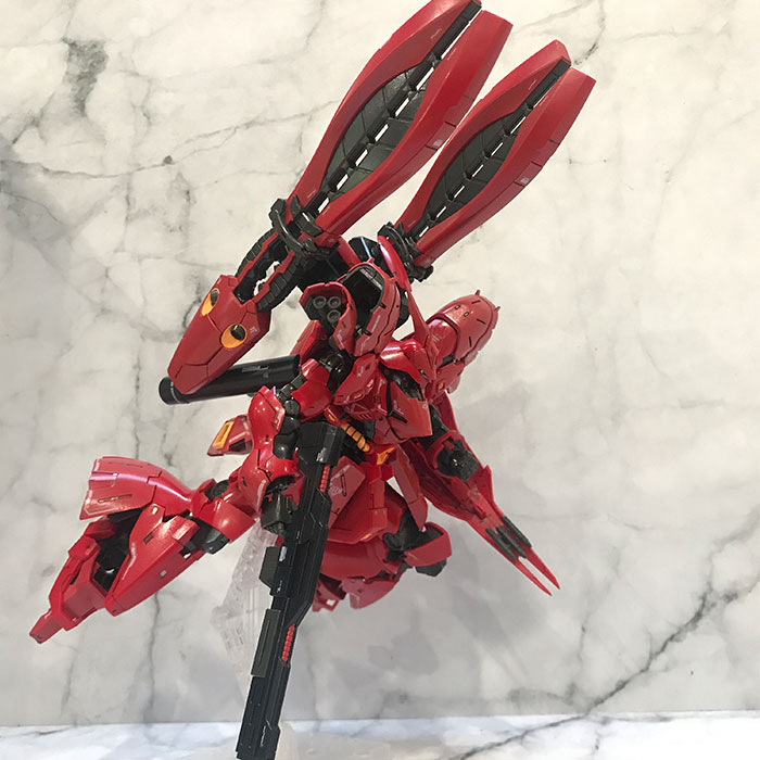 Fansnya Red Comet pasti ngerti sama kit satu ini. Tapi ini tuh bukan Sazabi biasa lho, tapi Sazabi Side F atau biasa disebut Sazabi FF. Kit ini ga jauh beda sama Sazabi biasa yang sama-sama didominasi sama beberapa separasi warna merah. Kit inituh punya proporsi lumayan gede dengan tinggi setelah dirakit hampir sama dengan tinggi kit di kelas MG atau 1/100 biasa macam Gundam mbah. Yang sangat berbeda dan jadi khas dari kit ini tuh ya senjata yang ada di bag. belakangnya. Buat kit Sazabi ini, senjatanya berbentuk mirip ‘capit kepiting’ yang bisa disimpan ke bag. belakang ditempat menyimpan funnel. Senjata ini bisa juga kok dibawa di tangan dan misal kalian mau posein udah ada juga effect part warna hijau yang pemasanngannya tinggal tempel-tempelin aja. Sayangnya kita cuma dapet 1pcs saja untuk effect hijaunya. Tapi ga perlu kecewa kok, karena kita juga dapet action base 5 clear serta effect funnel milik RG Nu Gundam Side F yang berwarna merah.