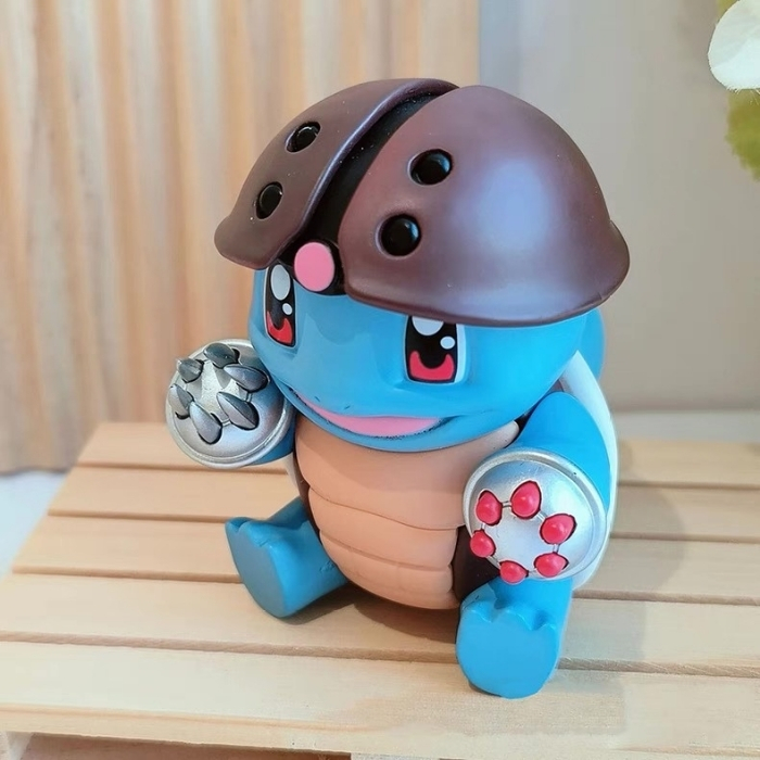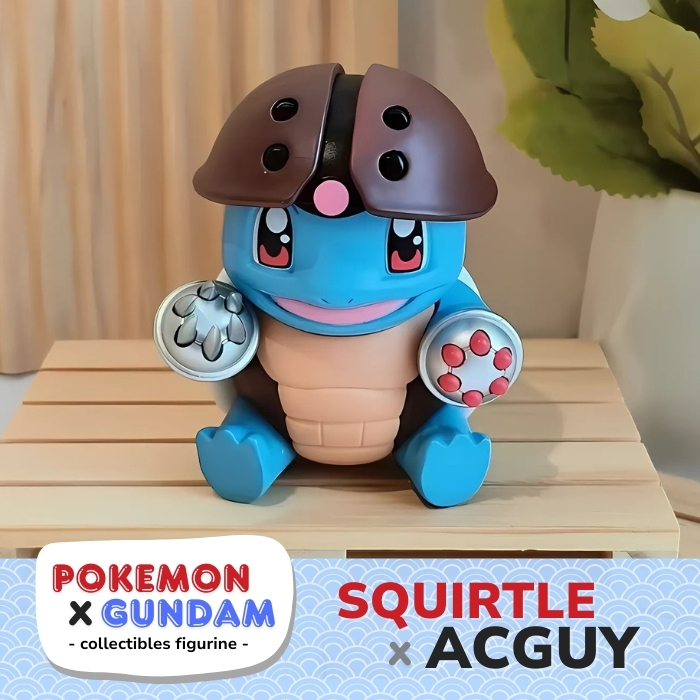 Desain Eksklusif: Squirtle tampil dalam armor Acguy berwarna cokelat-keemasan dengan aksen biru khas tubuhnya, lengkap dengan lensa mono-eye dan pelindung cakar tangan.